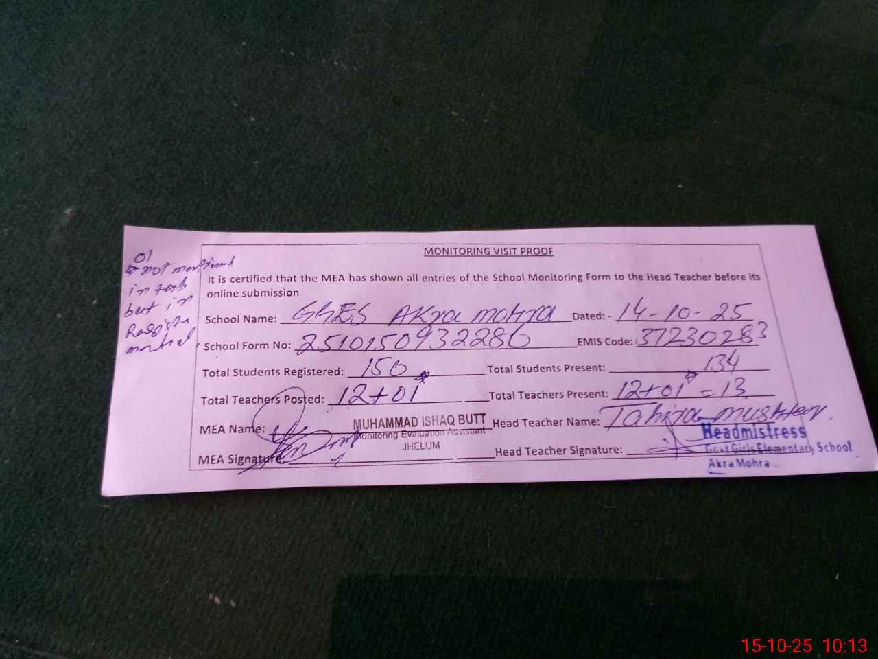 | Certified that this School was Inspected by the Undersigned MEA/DMO Today and the Information Stated Above is as Per Record. | |||||