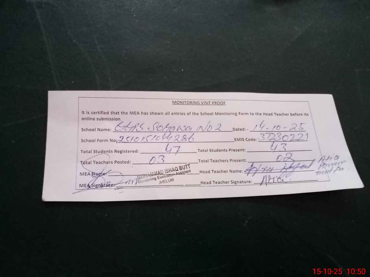 | Attendance Register | Head Teacher | MEA with School | Visit Proof |