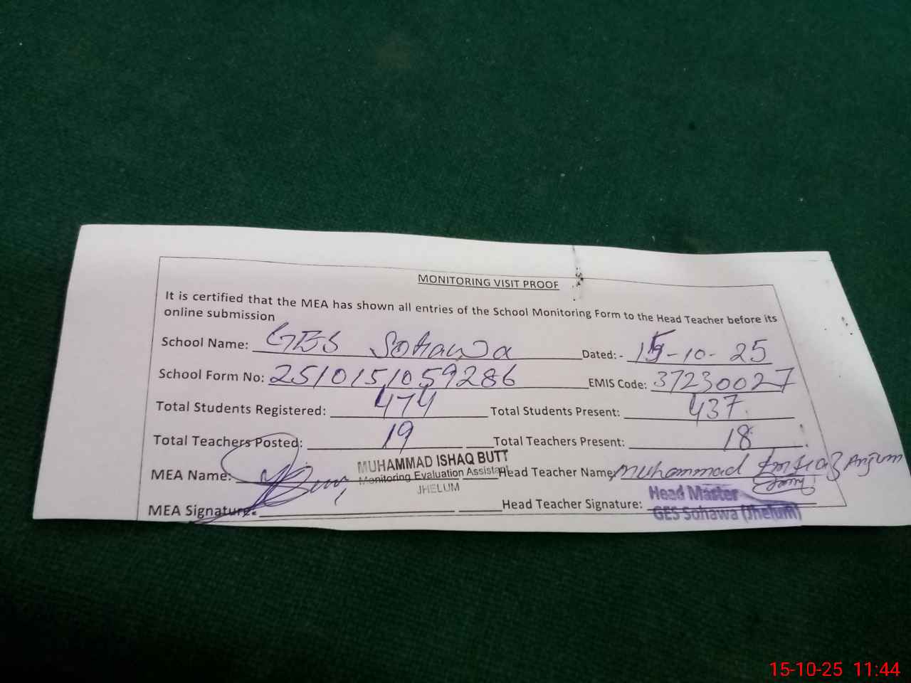| Certified that this School was Inspected by the Undersigned MEA/DMO Today and the Information Stated Above is as Per Record. | |||||