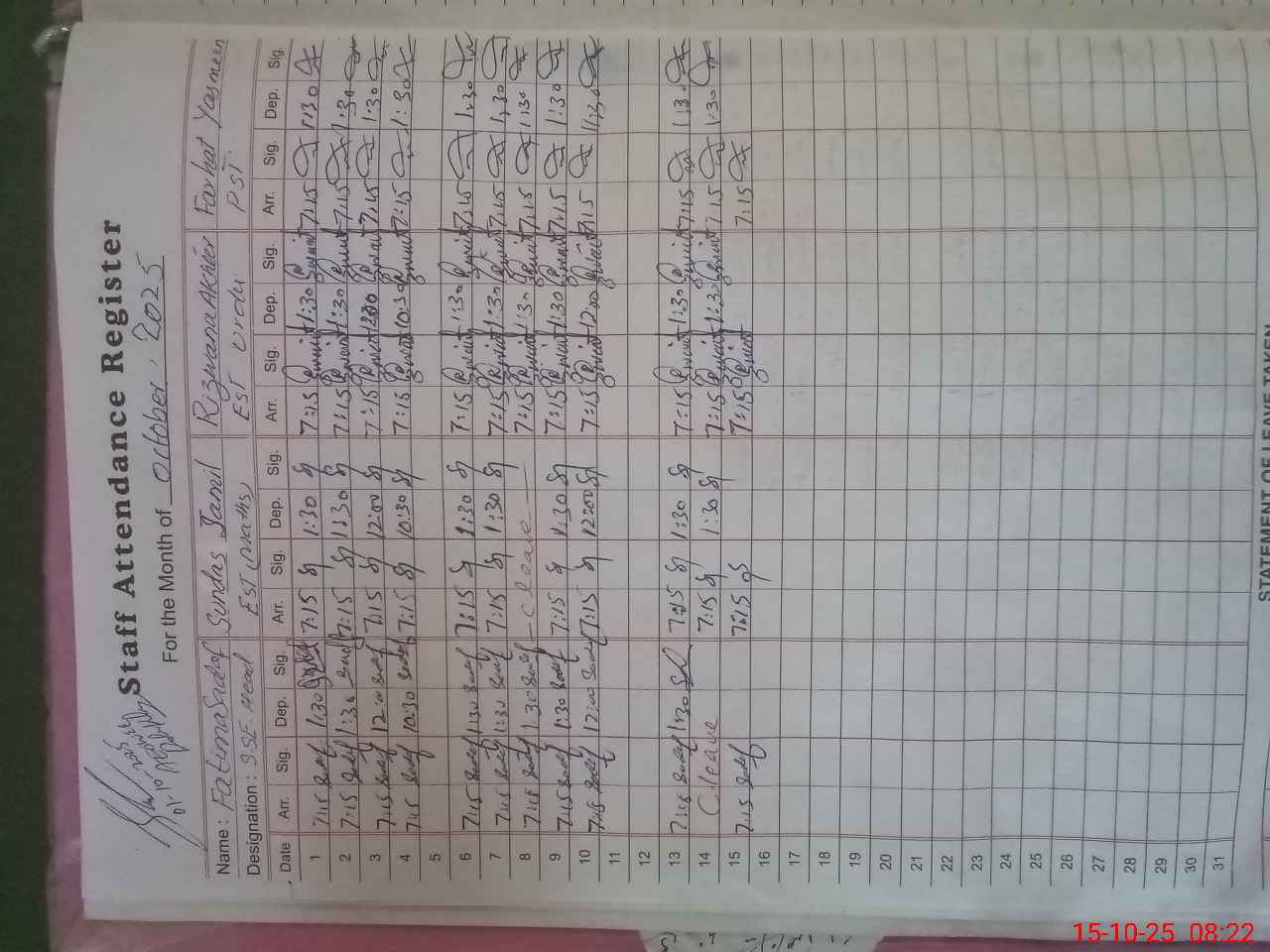 | CNIC | Full Name | Designation | R/C | Absence During Last Calender Month |