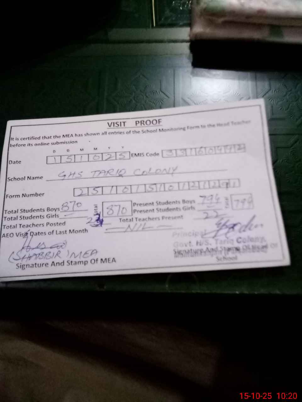 | Certified that this School was Inspected by the Undersigned MEA/DMO Today and the Information Stated Above is as Per Record. | |||||