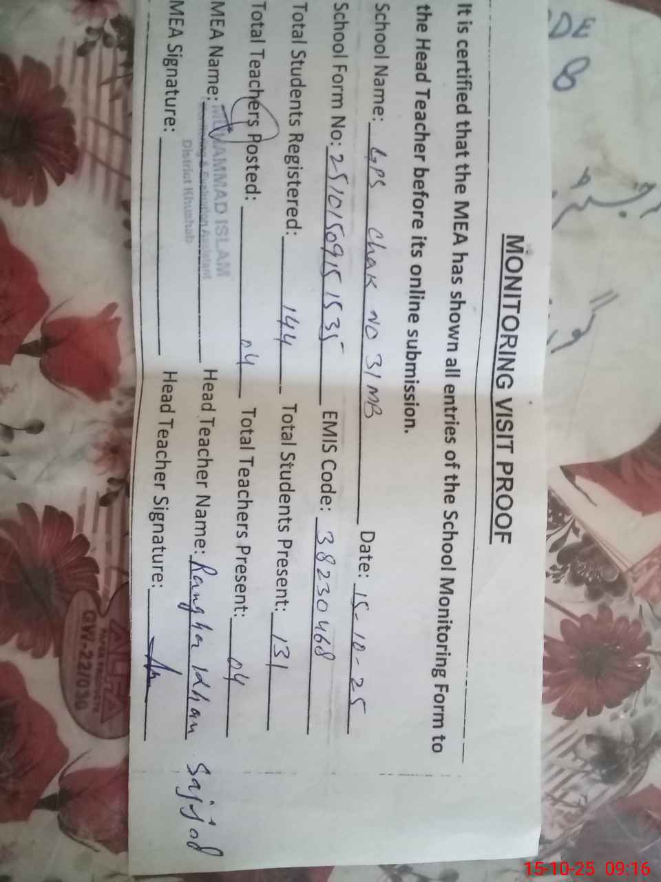 | Attendance Register | Head Teacher | MEA with School | Visit Proof |