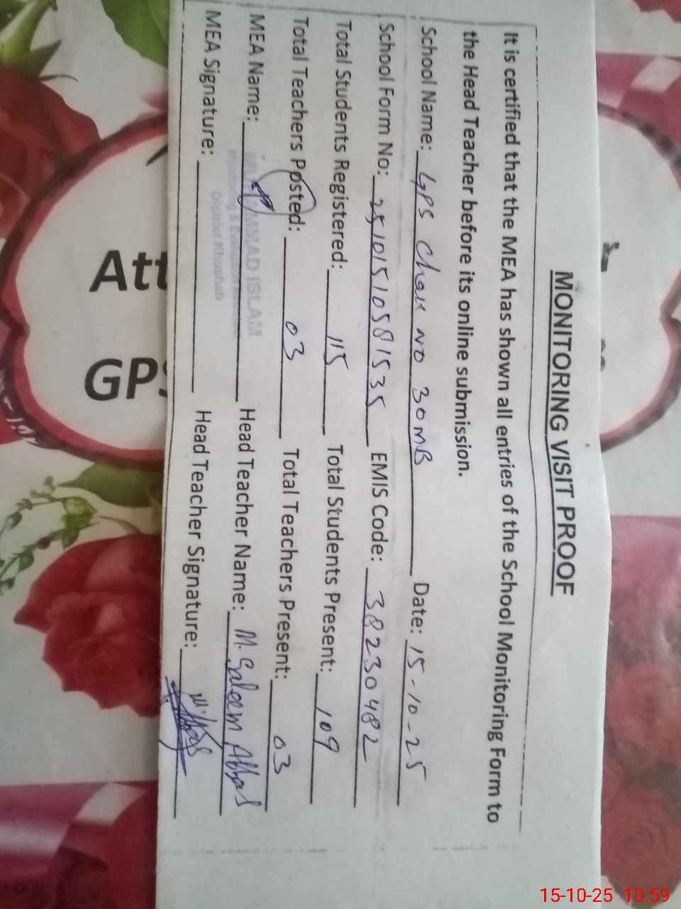 | Attendance Register | Head Teacher | MEA with School | Visit Proof |