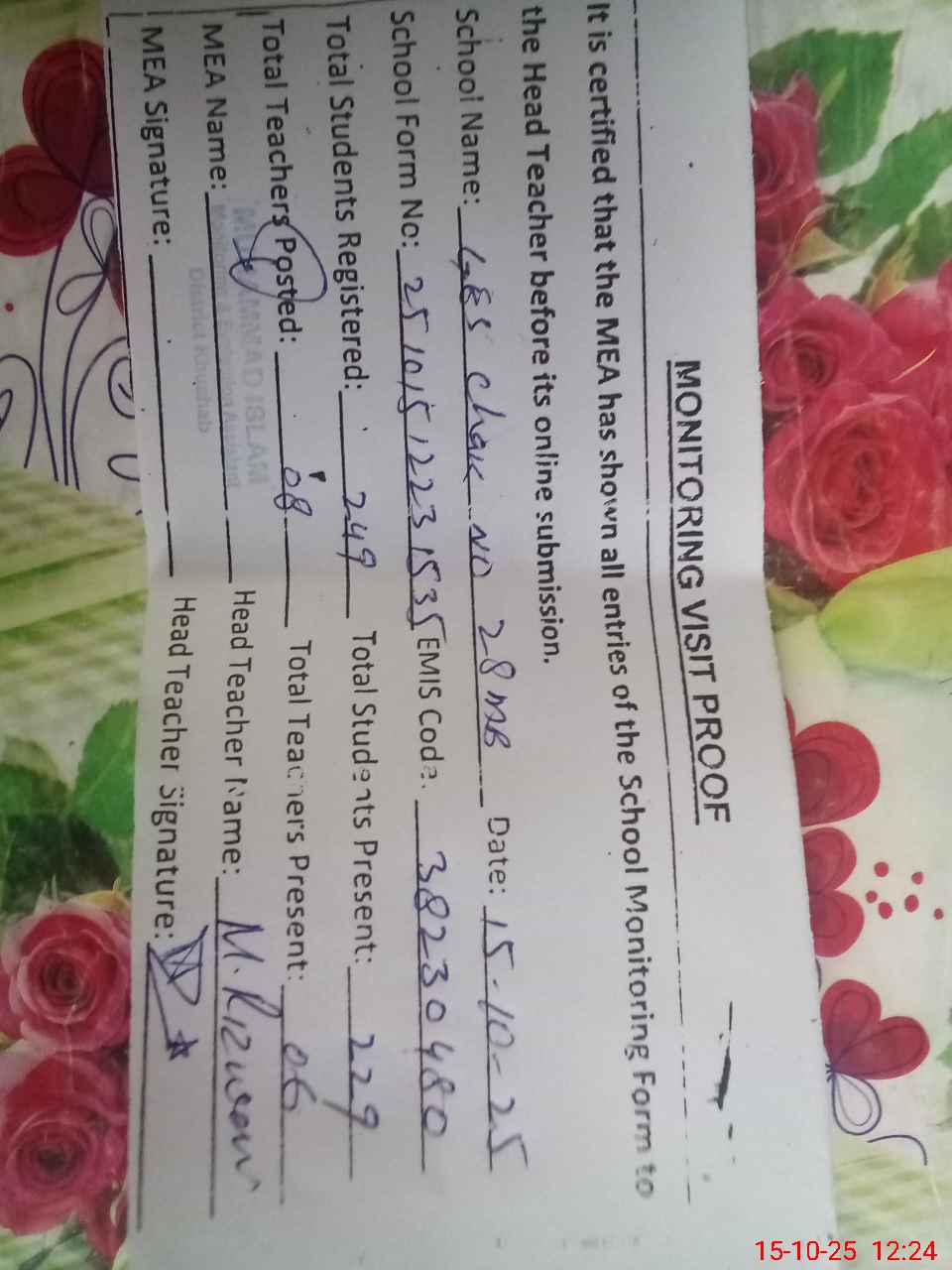 | Attendance Register | Head Teacher | MEA with School | Visit Proof |