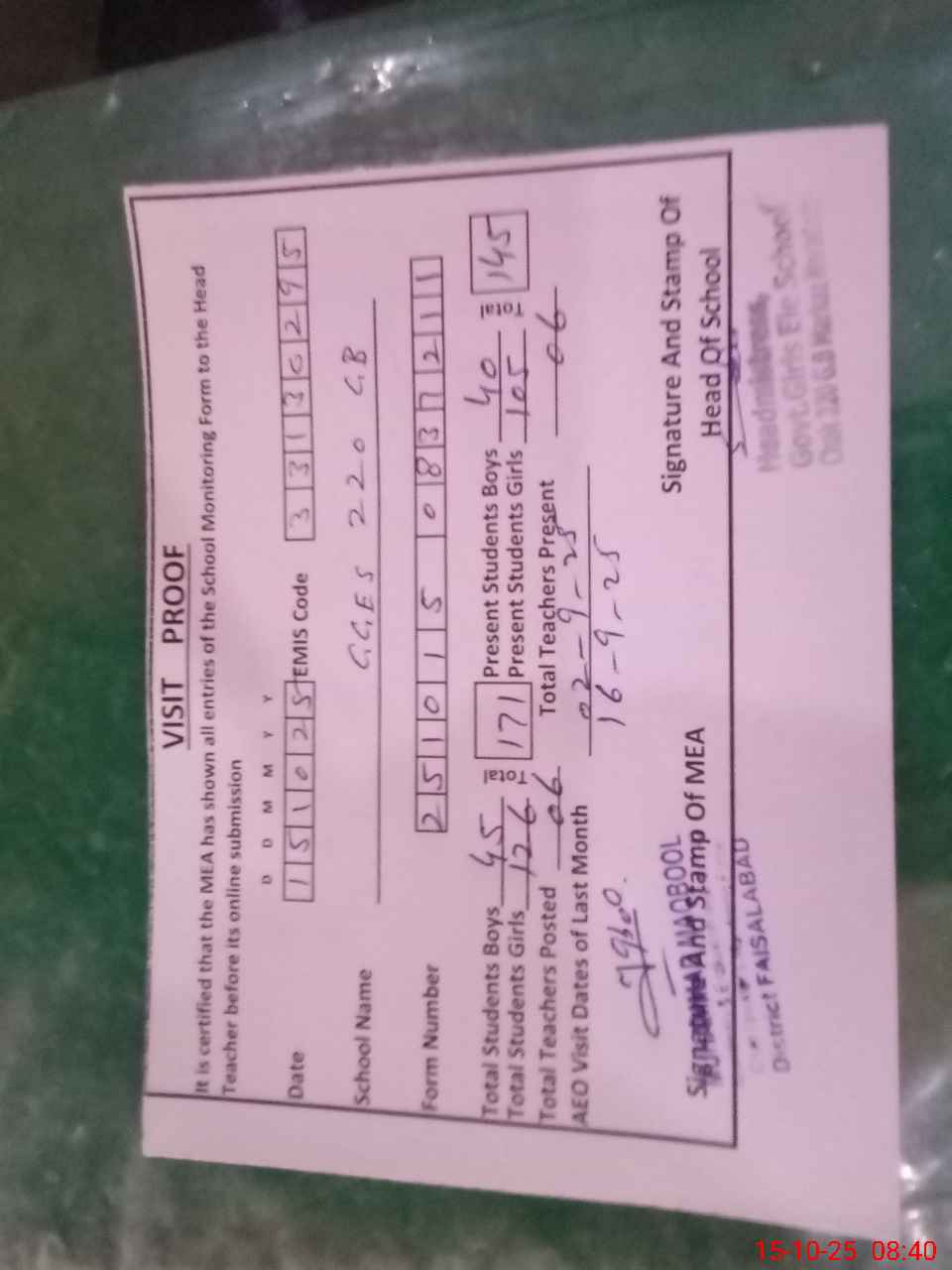 | EMIS Code: 33130295 | Name of School: GGES CHAK NO 220 GB | |||