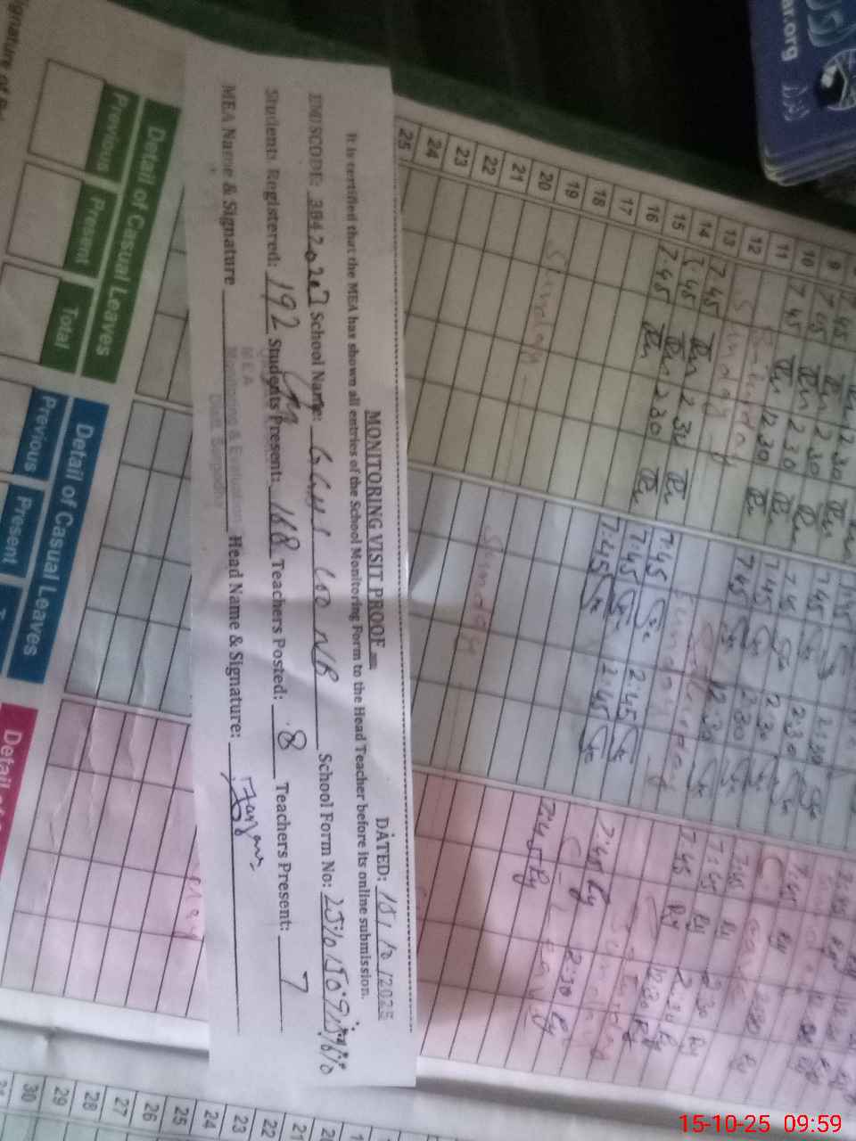 | Attendance Register | Head Teacher | MEA with School | Visit Proof |