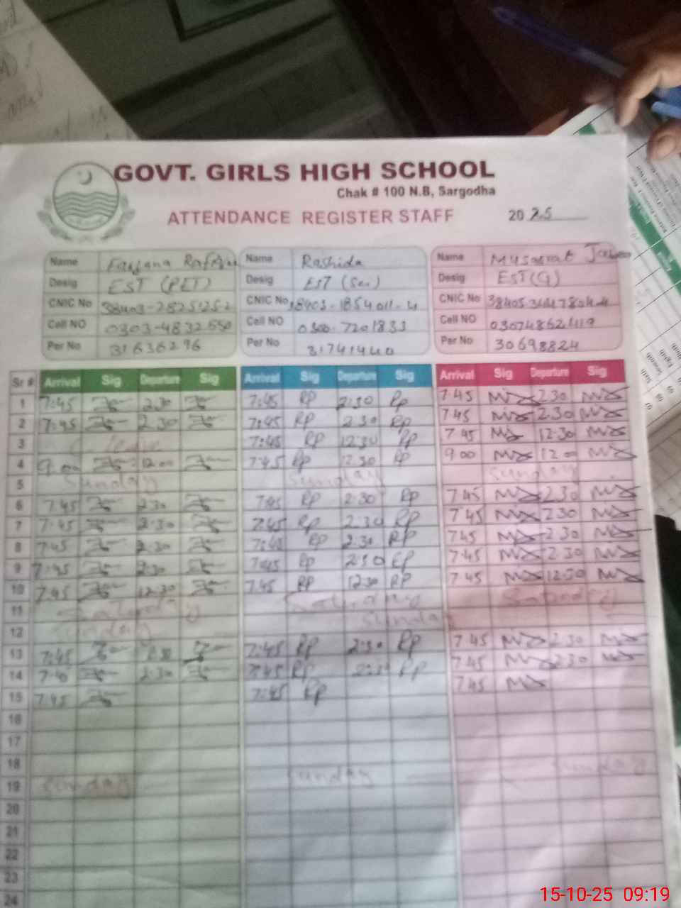 | CNIC | Full Name | Designation | R/C | Absence during last cal. month |