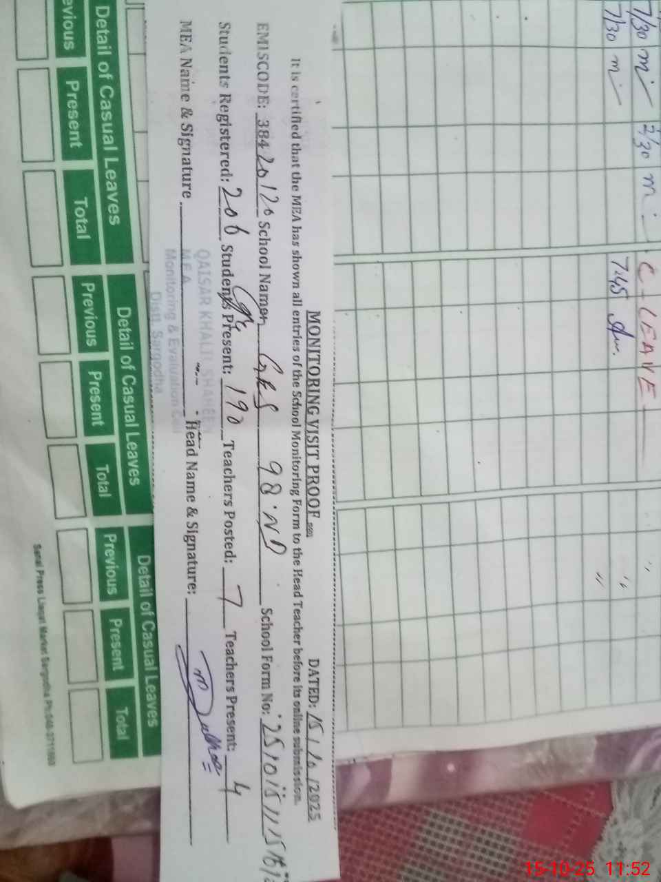 | Monitoring Date: 15-10-2025 | Start Time: 15-10-2025 11:15 AM | End Time: 15-10-2025 11:52 AM | Name of MEA: QA**** KH**** SH**** | |