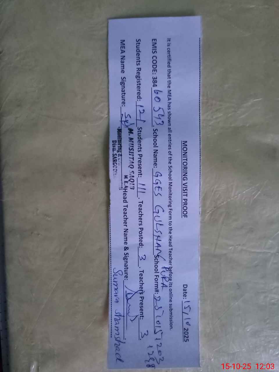 | Attendance Register | Head Teacher | MEA with School | Visit Proof |