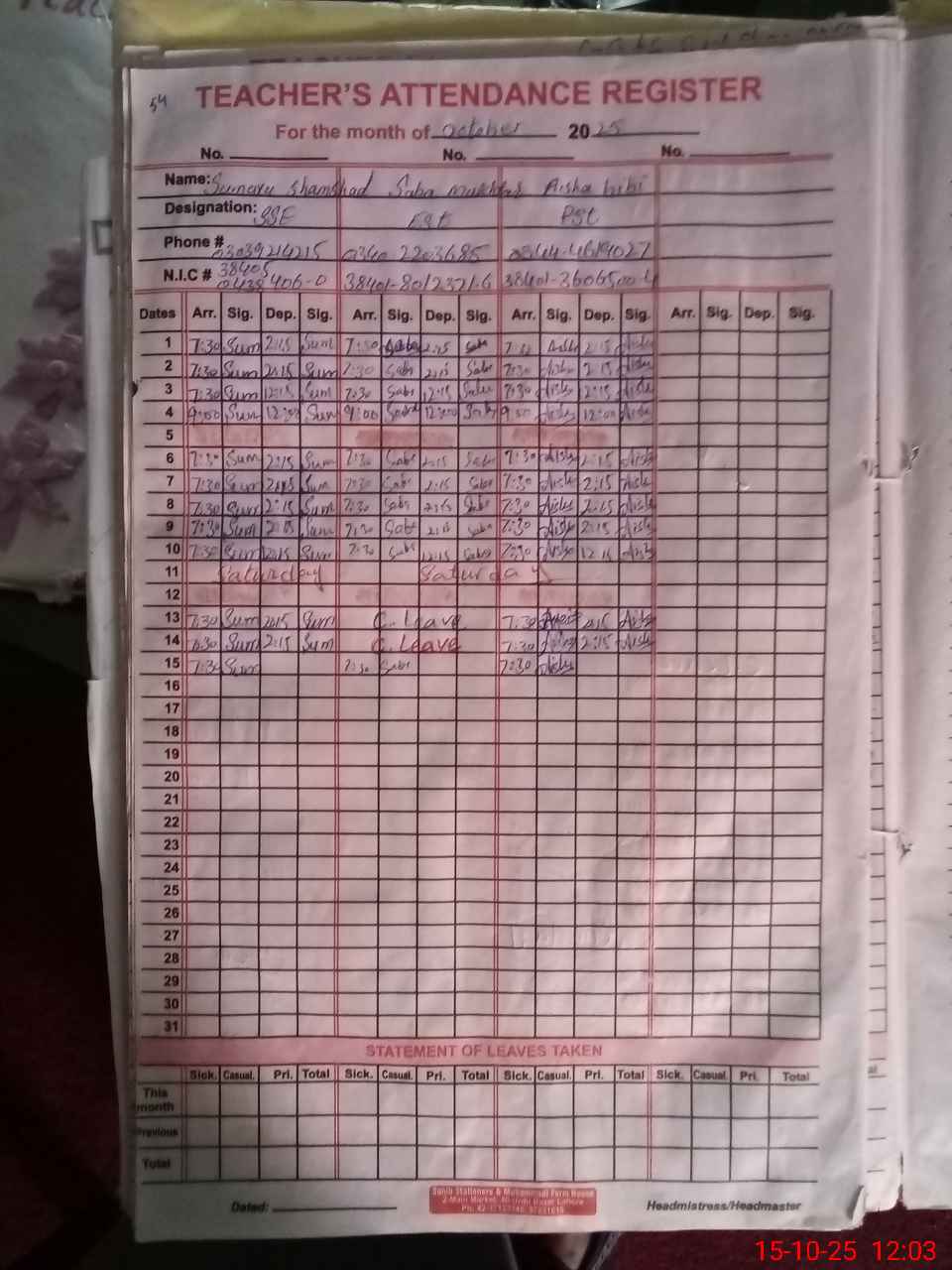 | CNIC | Full Name | Designation | R/C | Absence During Last Calender Month |
