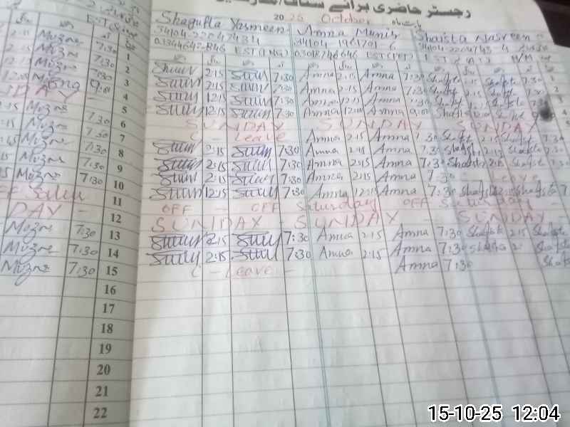 | CNIC | Full Name | Designation | R/C | Absence During Last Calender Month |