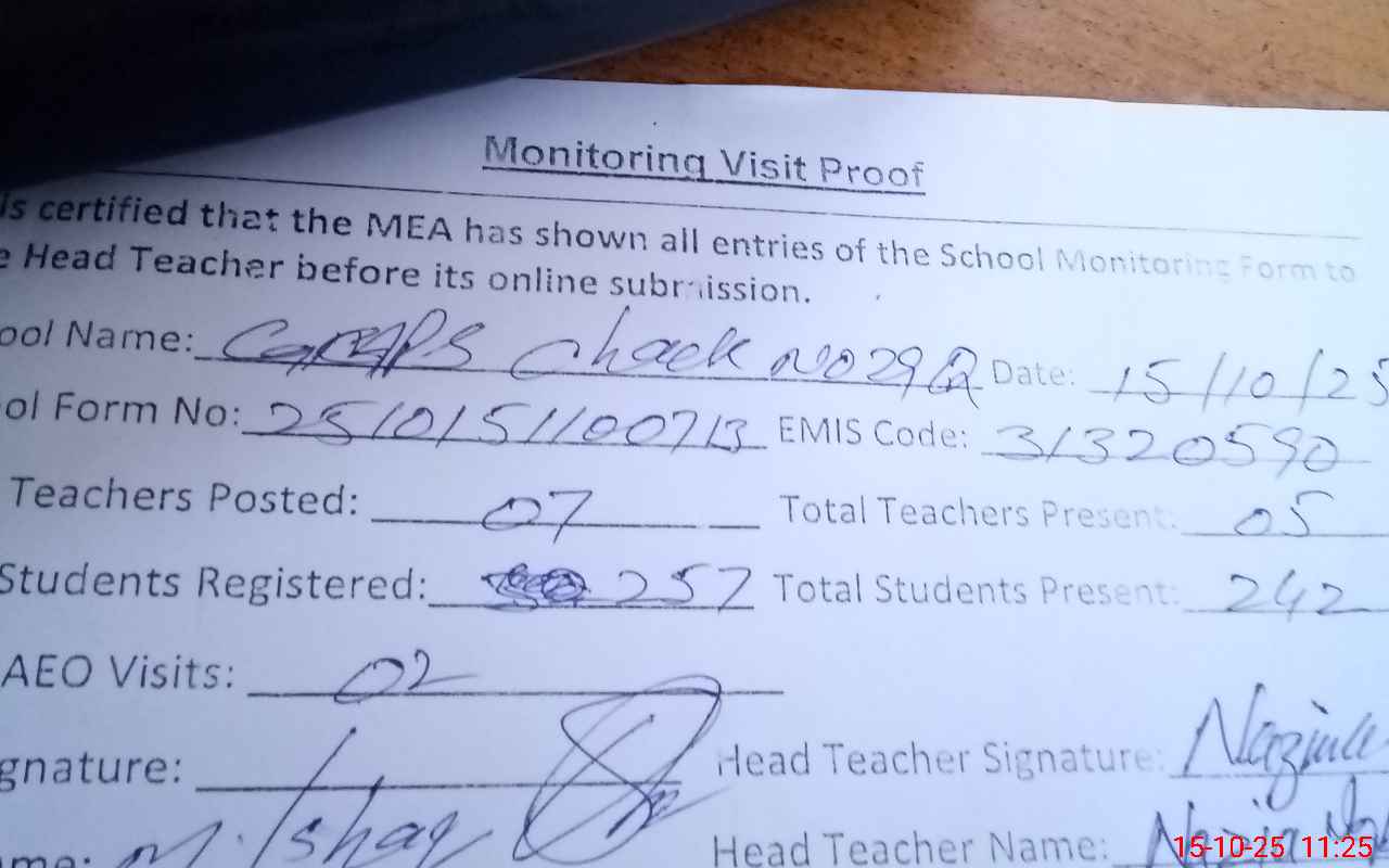 | Attendance Register | Head Teacher | MEA with School | Visit Proof |
