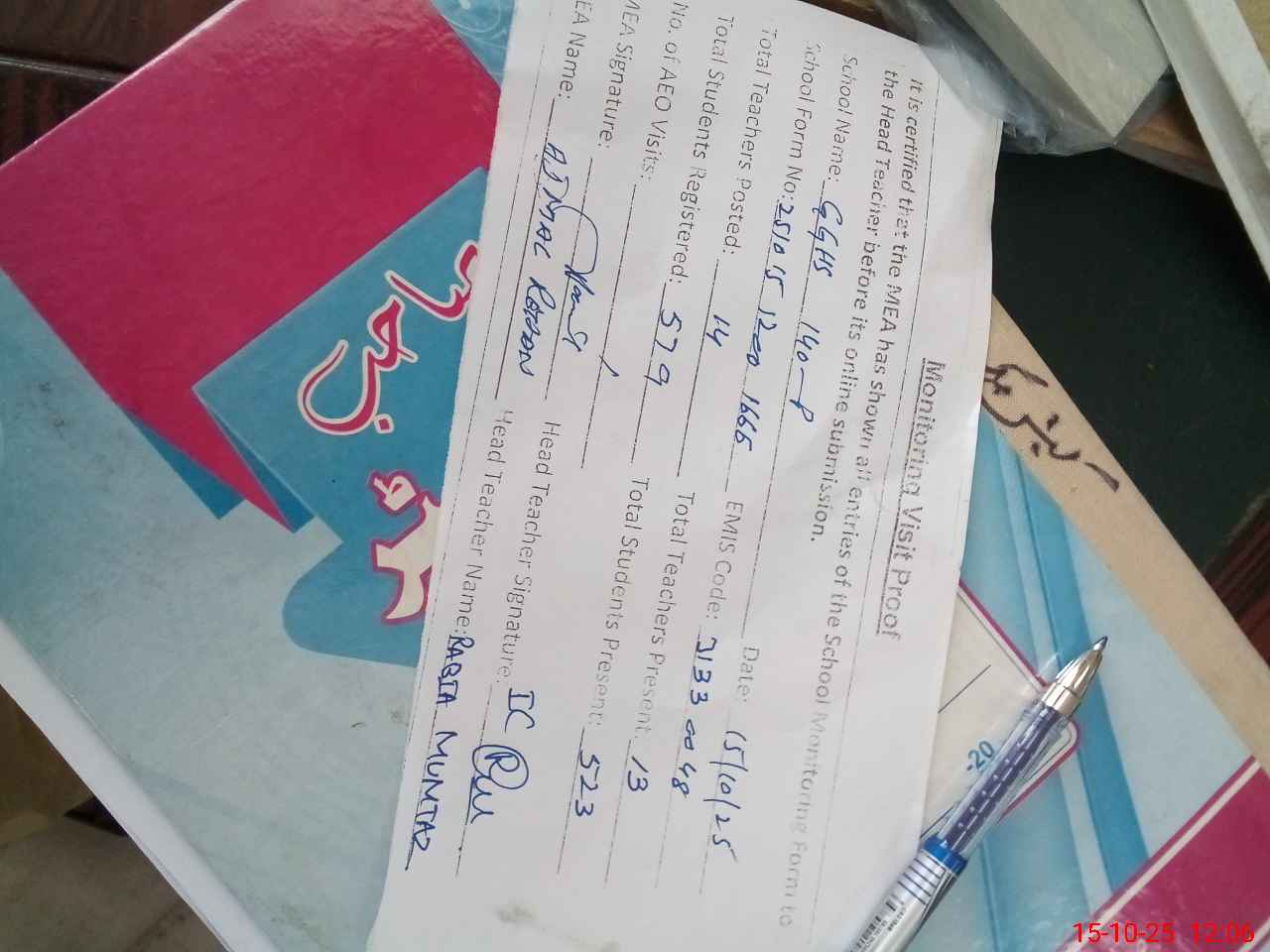 | Attendance Register | Head Teacher | MEA with School | Visit Proof |