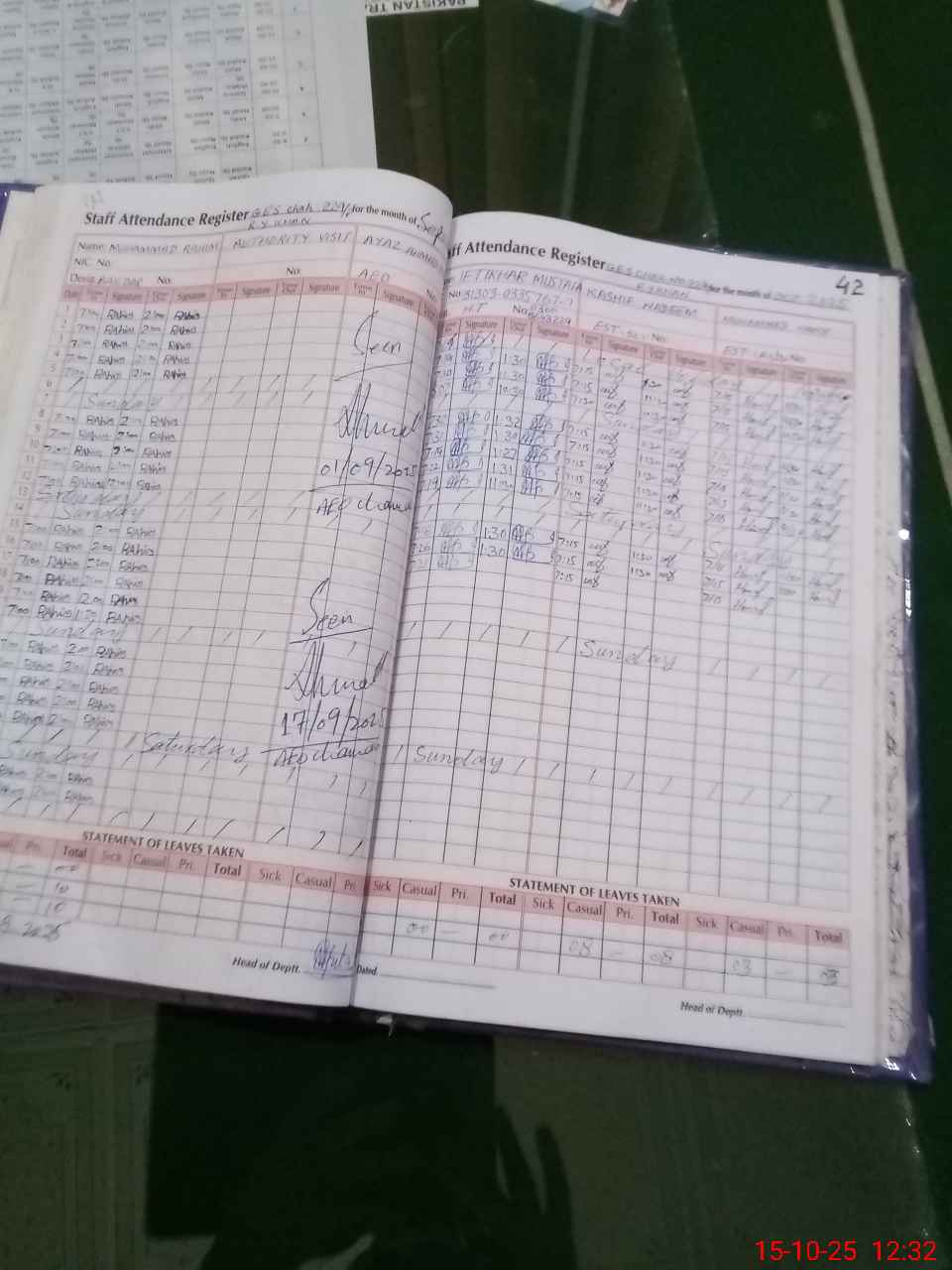 | CNIC | Full Name | Designation | R/C | Absence During Last Calender Month |