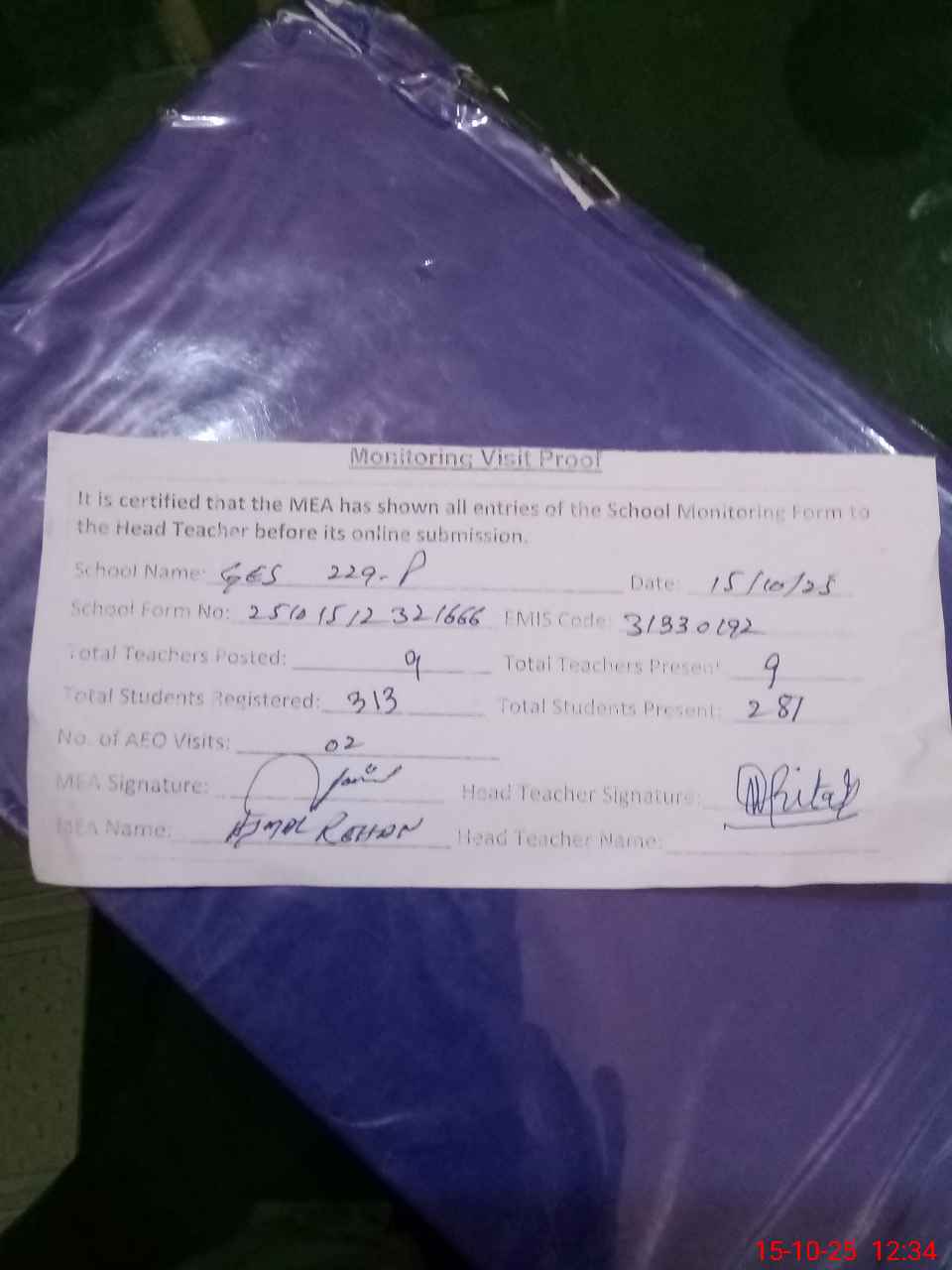 | Attendance Register | Head Teacher | MEA with School | Visit Proof |