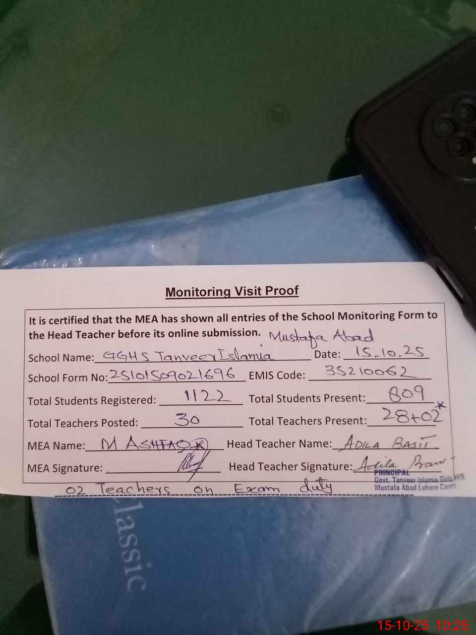 | Attendance Register | Head Teacher | MEA with School | Visit Proof |