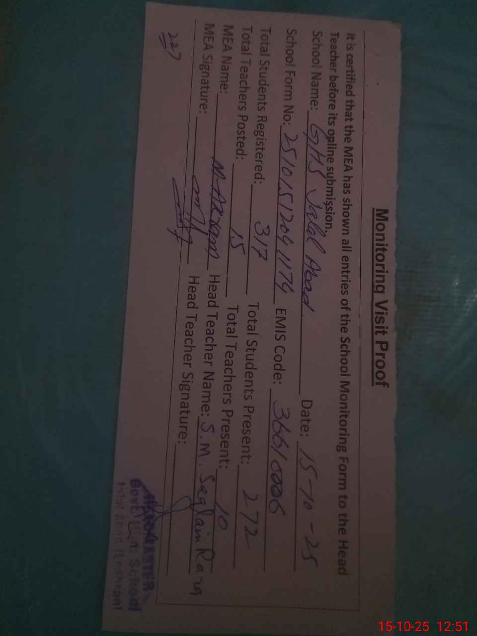 | Attendance Register | Head Teacher | MEA with School | Visit Proof |