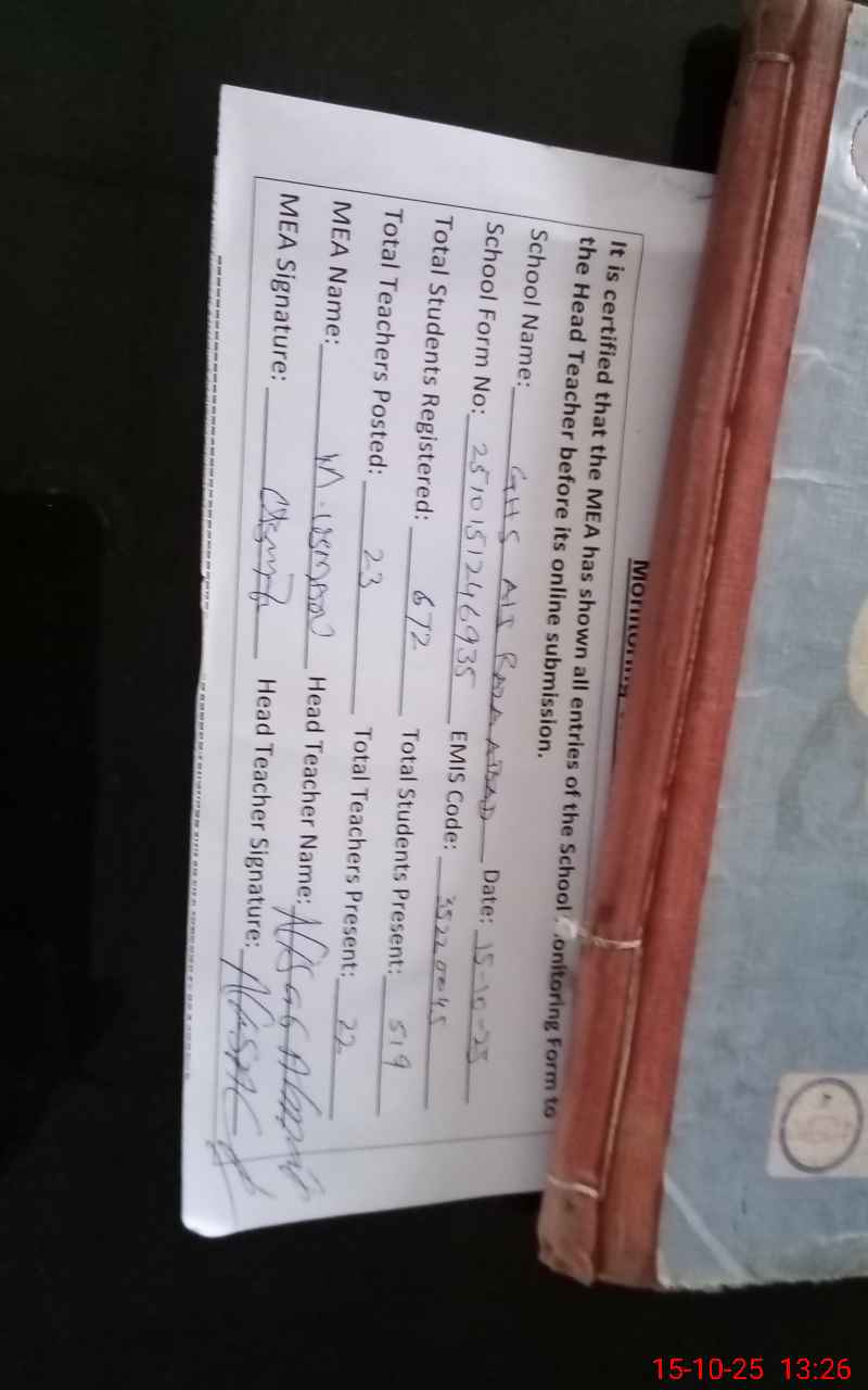 | Remarks (Use Separate Page if Required): Ali Awais EST is absent due to leave is not available 01 wash room is nonfunctional due to no water tap and door is not available NSB and FTF data was not available also NSB and FTF registers were not available Books record is not available Soap was not available at maximum hand washing points White wash is required in classes and washrooms | |||||