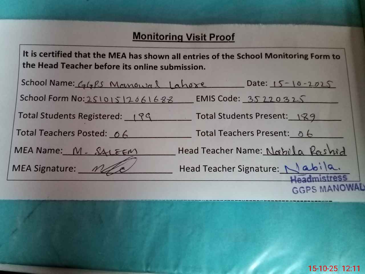 | EMIS Code: 35220325 | Name of School: GGPS MANOWAL,LAHORE | |||