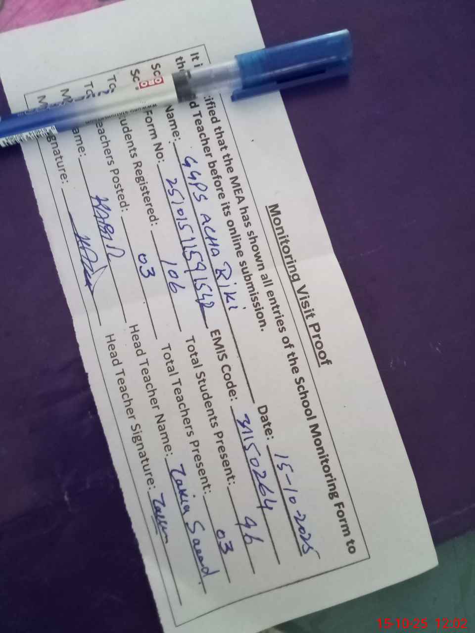 | Attendance Register | Head Teacher | MEA with School | Visit Proof |