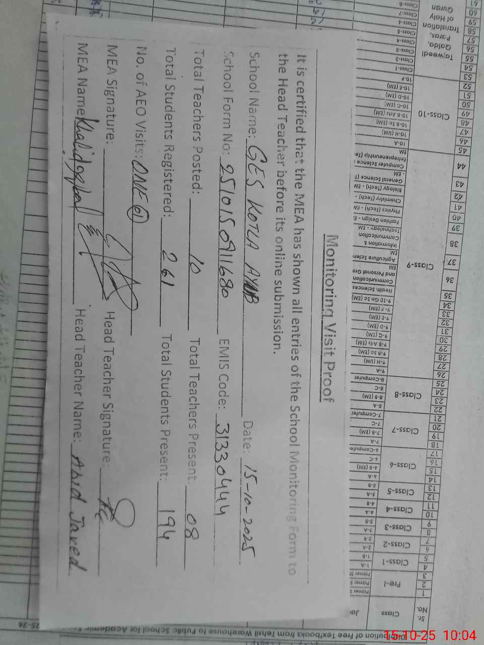 | Remarks (Use Separate Page if Required): Class redum verification is not updated on mea tab as per sis and online teacher attendance updated on sis today and five classes are sitting on open air and school NSB amount about 190000 RS used for new under construction building | |||||
