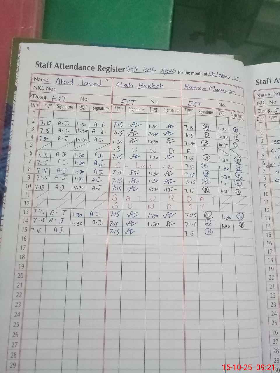 | CNIC | Full Name | Designation | R/C | Absence During Last Calender Month |