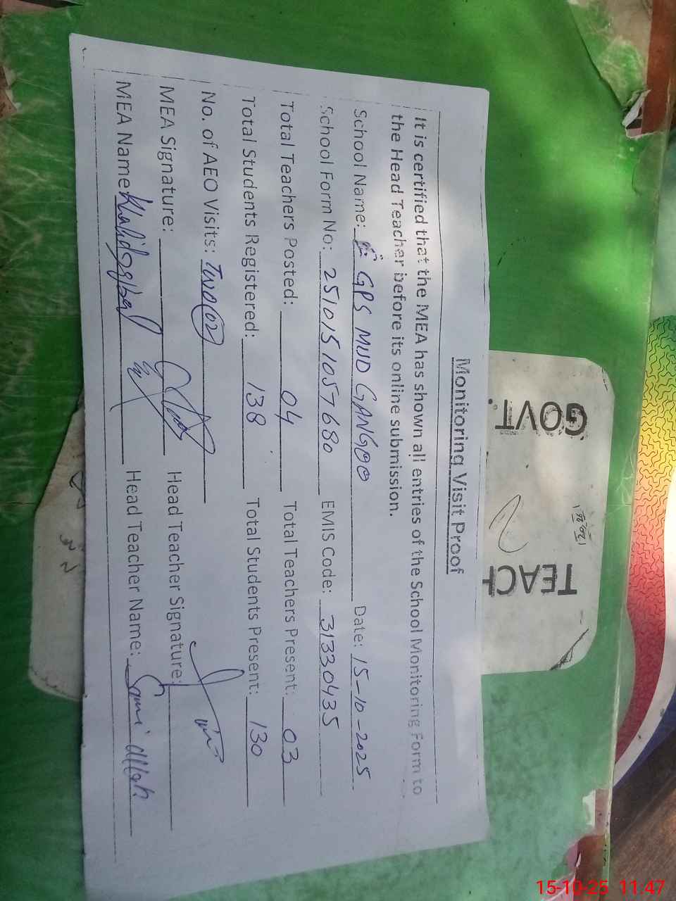 | Attendance Register | Head Teacher | MEA with School | Visit Proof |