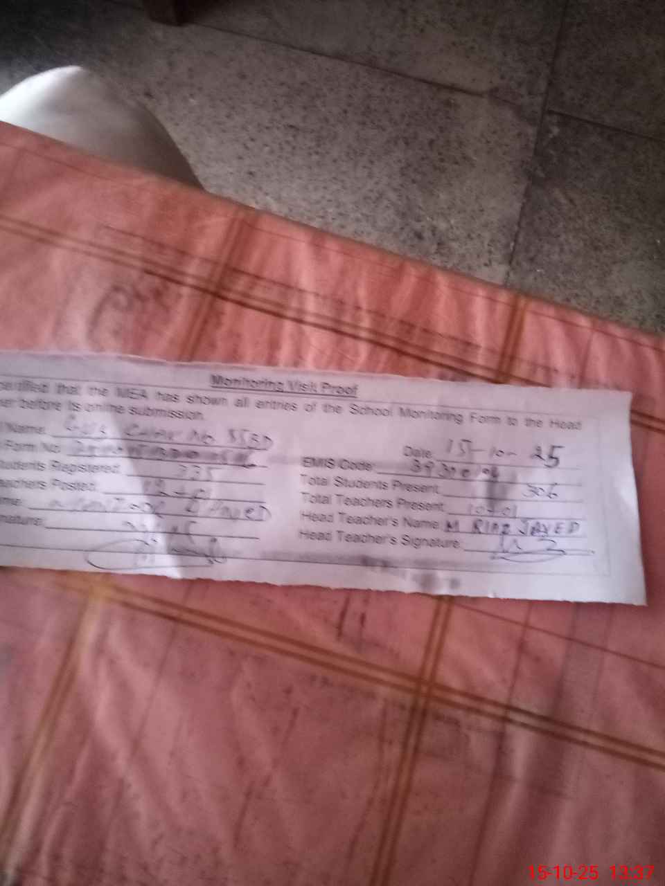 | Name: MU**** Ri**** Ja**** Designation: (School Headmaster's/Headmistress's) SST Phone/Cell Number: 03**** |