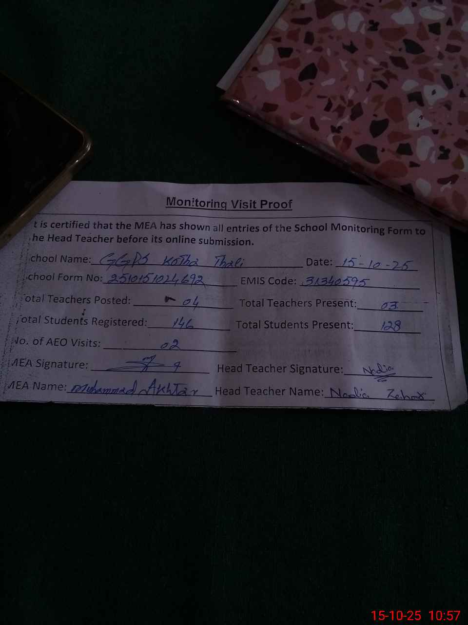 | Attendance Register | Head Teacher | MEA with School | Visit Proof |