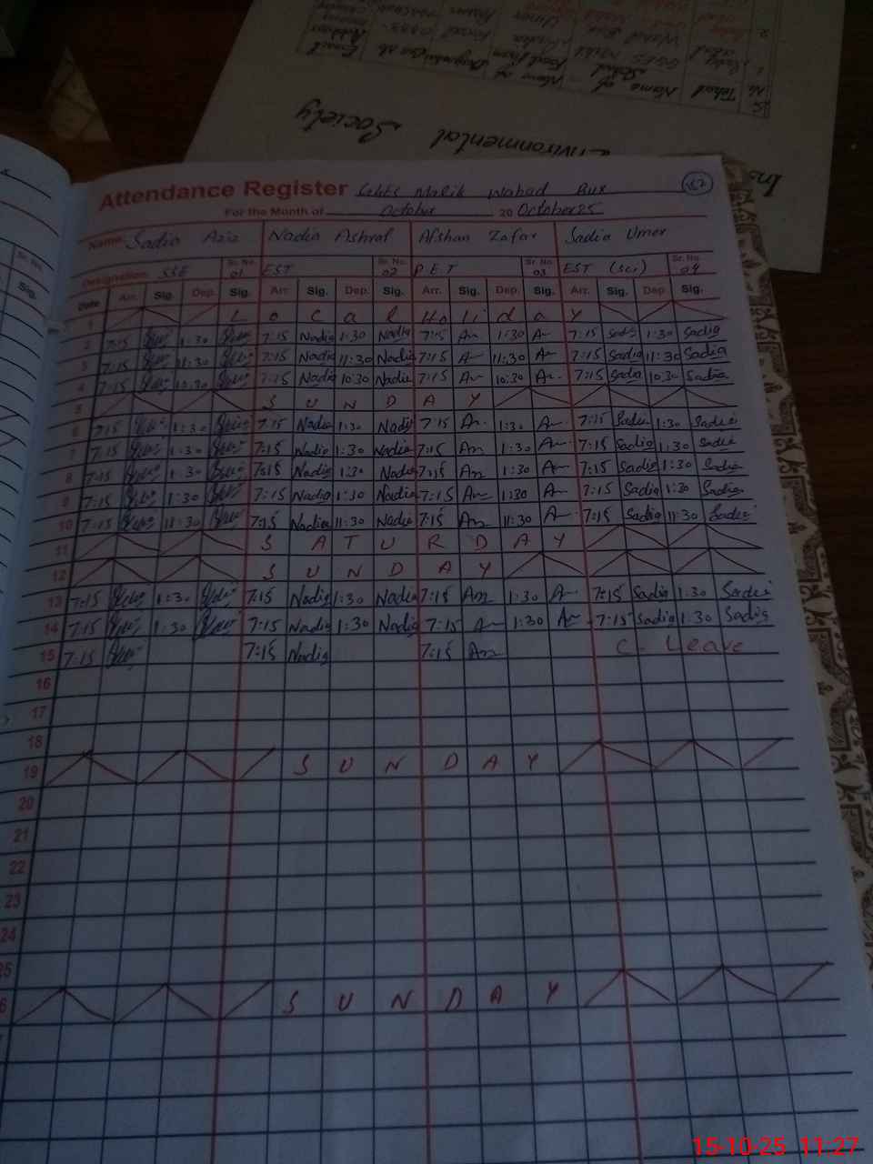 | CNIC | Full Name | Designation | R/C | Absence During Last Calender Month |
