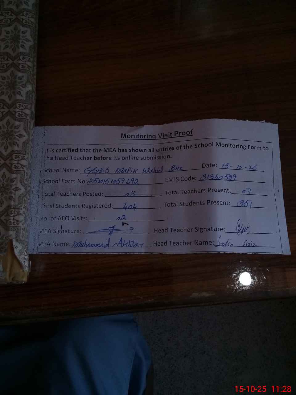 | Attendance Register | Head Teacher | MEA with School | Visit Proof |
