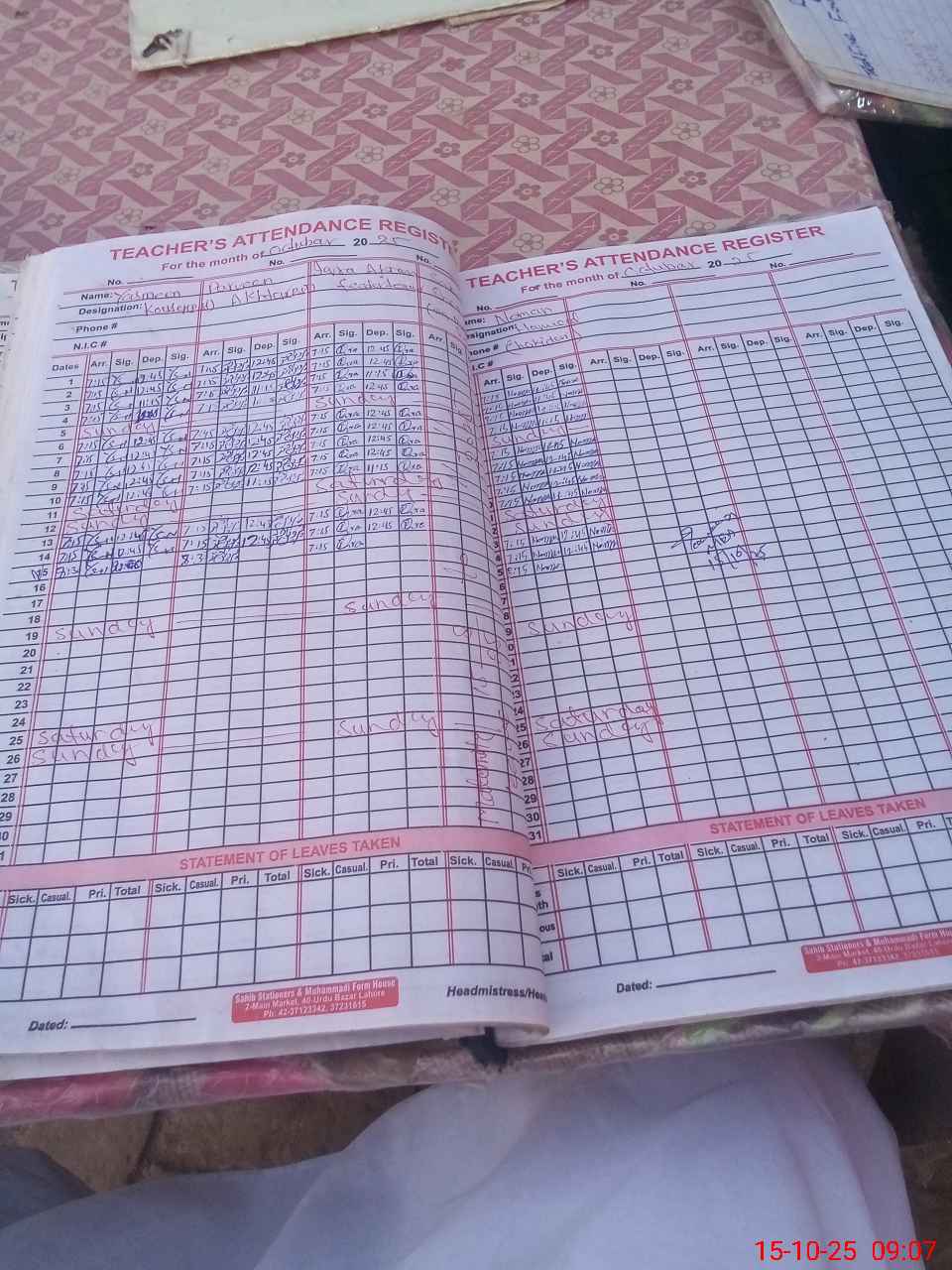 | CNIC | Full Name | Designation | R/C | Absence During Last Calender Month |