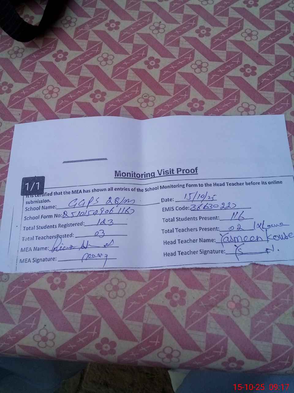 | Attendance Register | Head Teacher | MEA with School | Visit Proof |