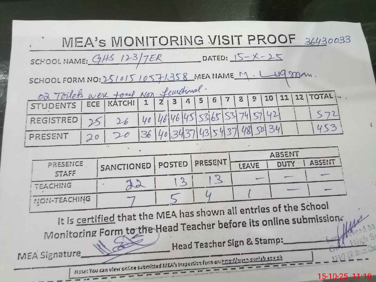 | Attendance Register | Head Teacher | MEA with School | Visit Proof |