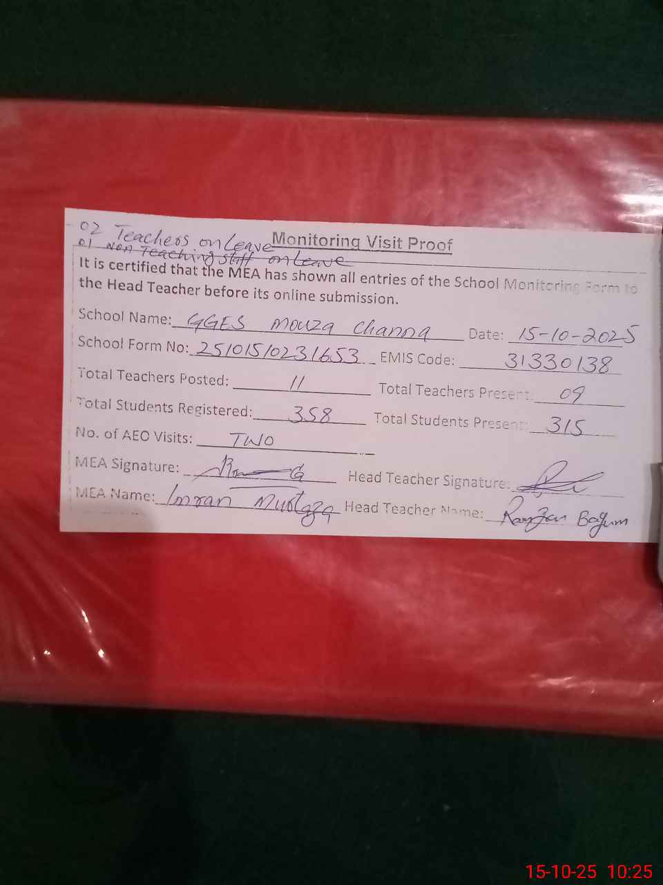 | Attendance Register | Head Teacher | MEA with School | Visit Proof |