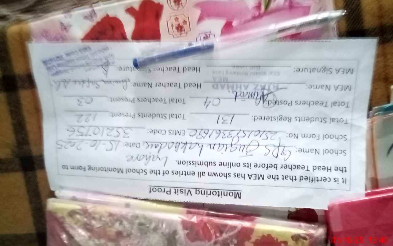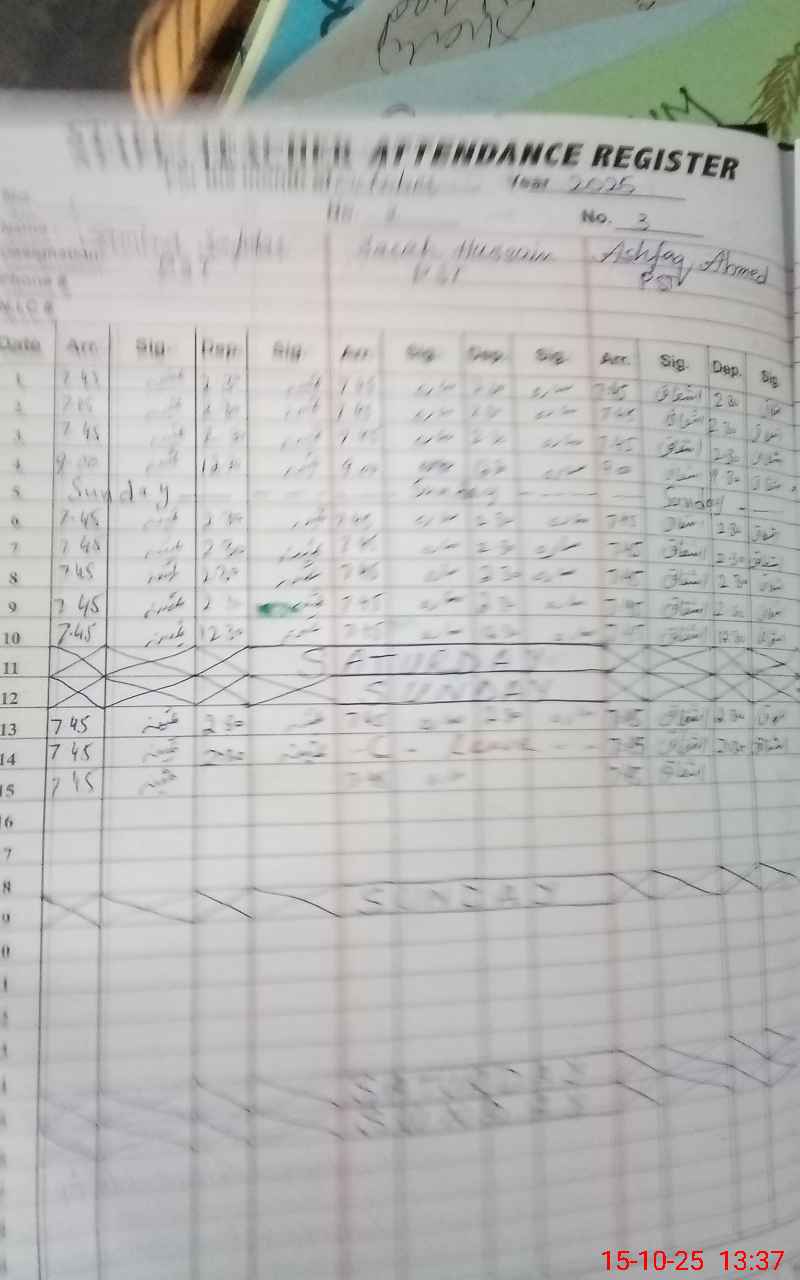 | Remarks (Use Separate Page if Required): Teacher Sumaira was on stop gap duty up to 09 October 2025 Latest latest letter not available so mark her absent | |||||