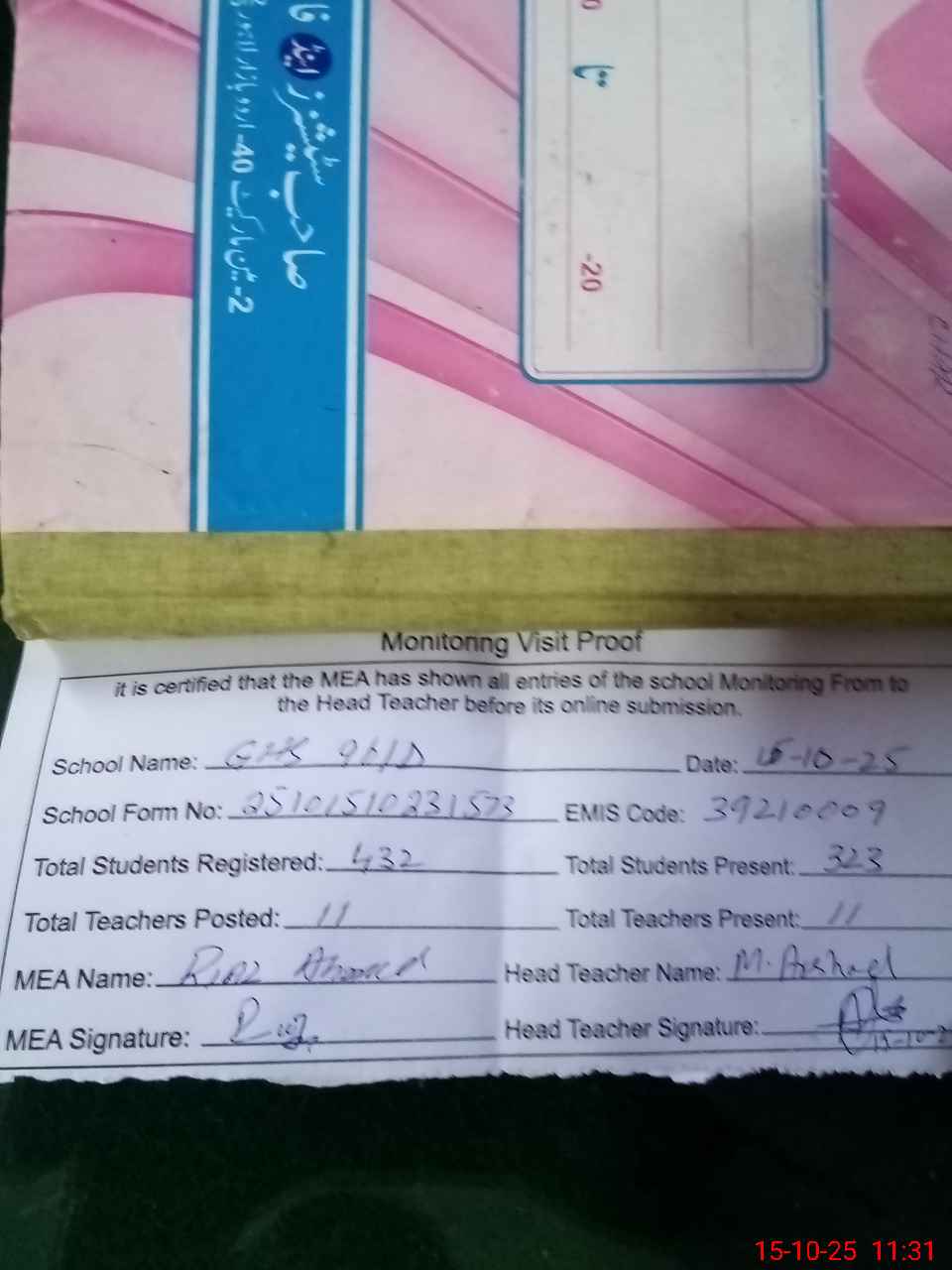| Attendance Register | Head Teacher | MEA with School | Visit Proof |
