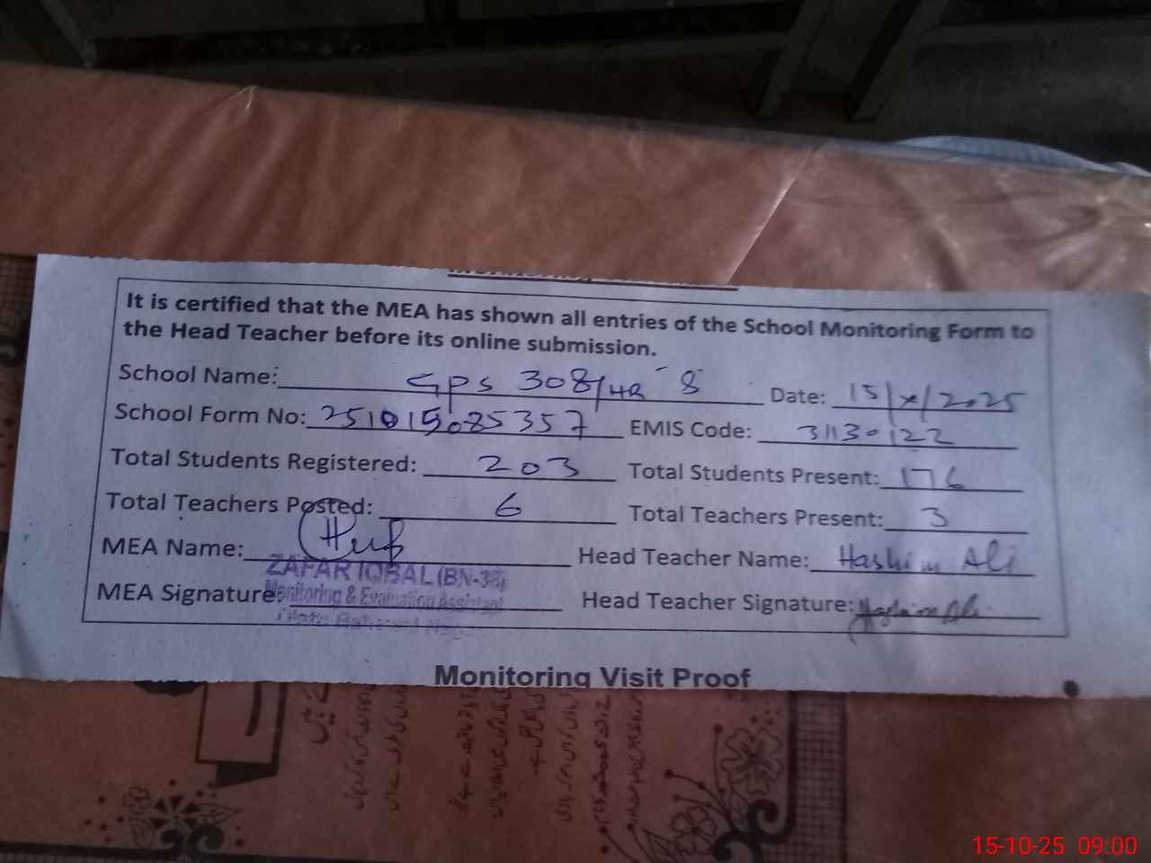 | Monitoring Date: 15-10-2025 | Start Time: 15-10-2025 08:41 AM | End Time: 15-10-2025 09:00 AM | Name of MEA: Za**** Iq**** BN**** | |