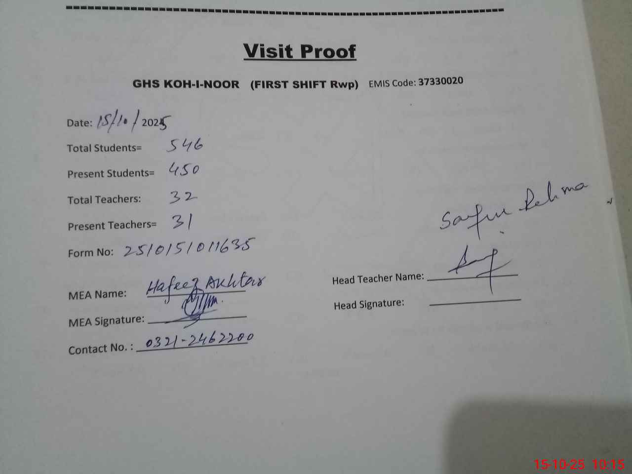 | EMIS Code: 37330020 | Name of School: GHS KOH-I-NOOR RAWALPINDI | |||