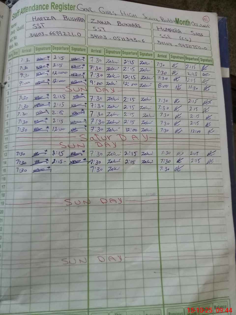 | CNIC | Full Name | Designation | R/C | Absence During Last Calender Month |