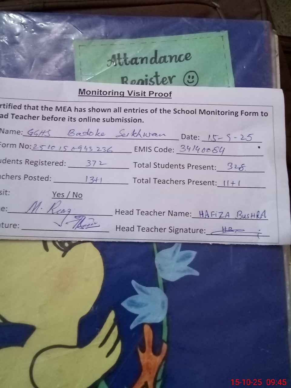 | Attendance Register | Head Teacher | MEA with School | Visit Proof |