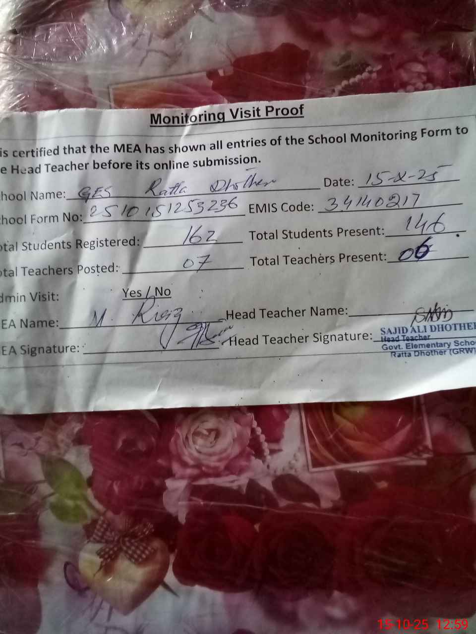 | Attendance Register | Head Teacher | MEA with School | Visit Proof |