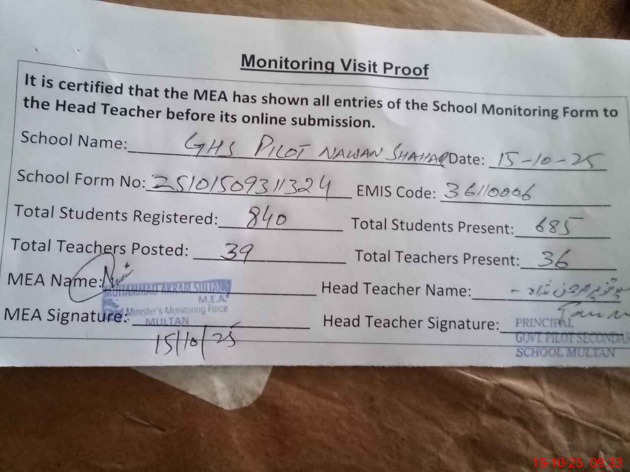 | Certified that this School was Inspected by the Undersigned MEA/DMO Today and the Information Stated Above is as Per Record. | |||||