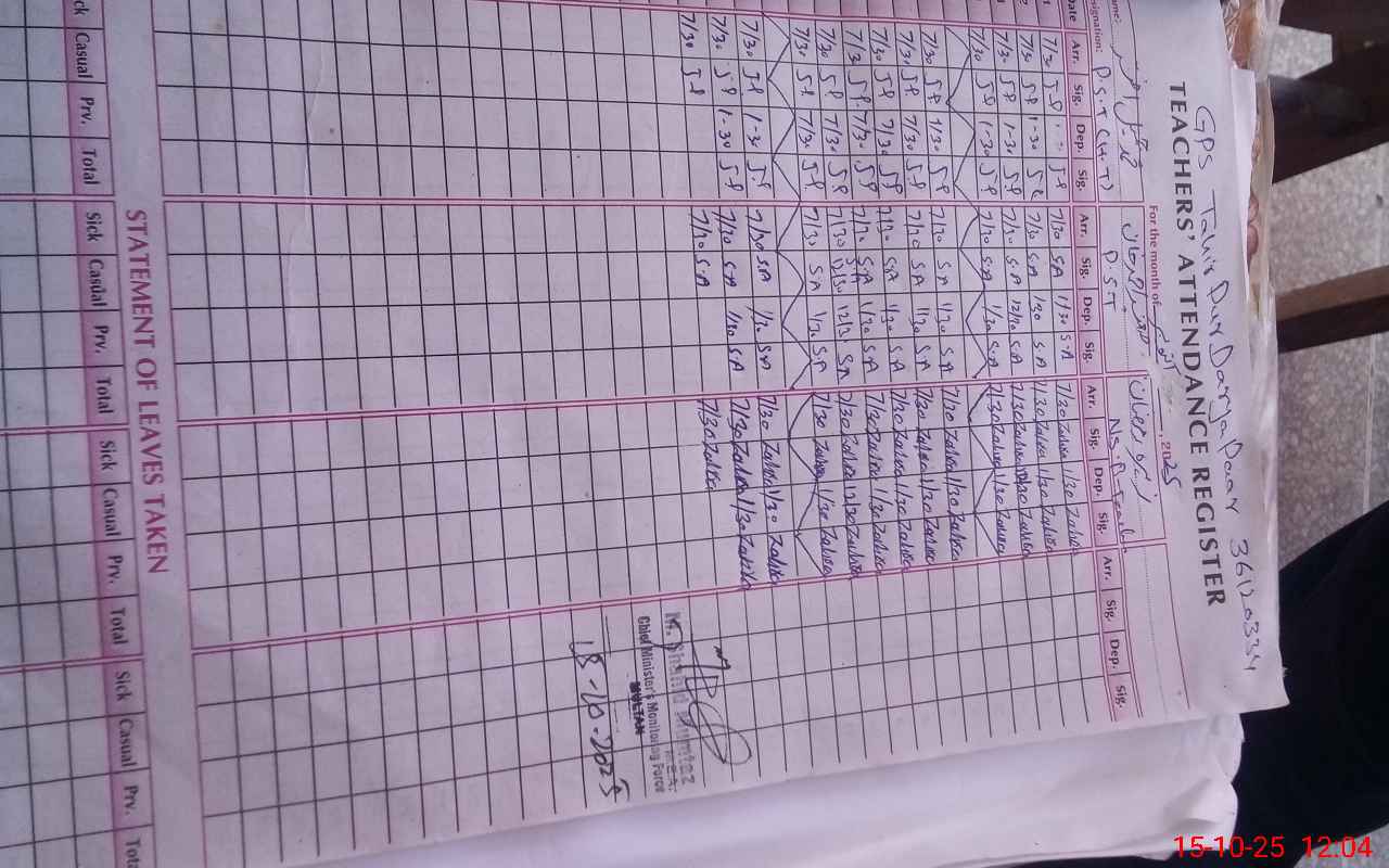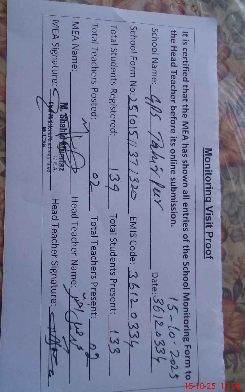 | EMIS Code: 36120334 | Name of School: GPS TAHIR PUR SHUJABAD | |||