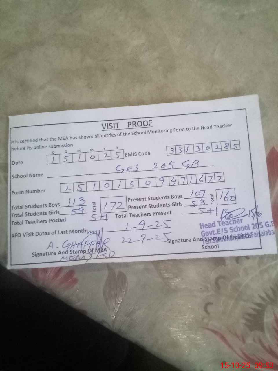 | EMIS Code: 33130285 | Name of School: GES 205/GB | |||