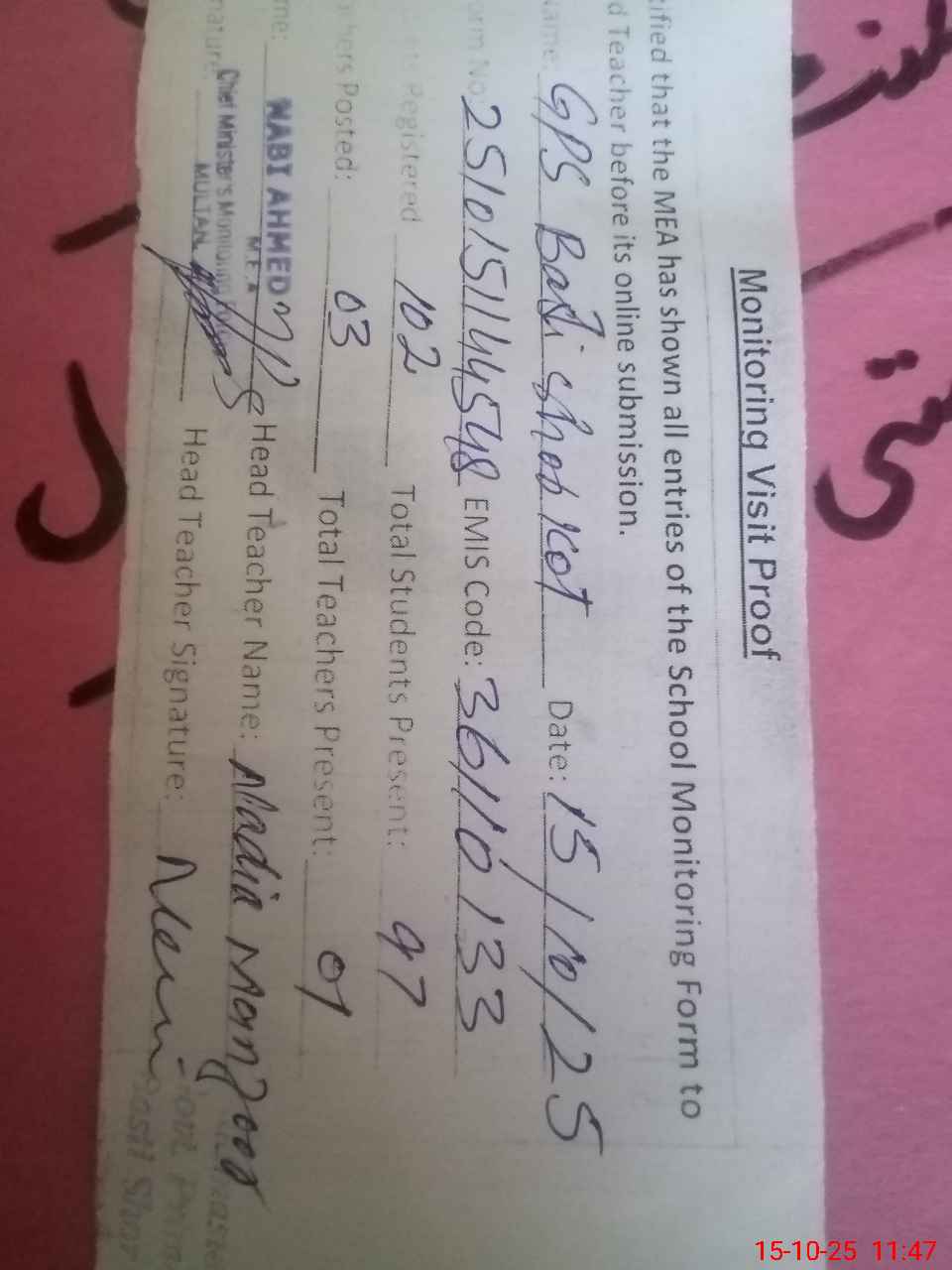 | Certified that this School was Inspected by the Undersigned MEA/DMO Today and the Information Stated Above is as Per Record. | |||||