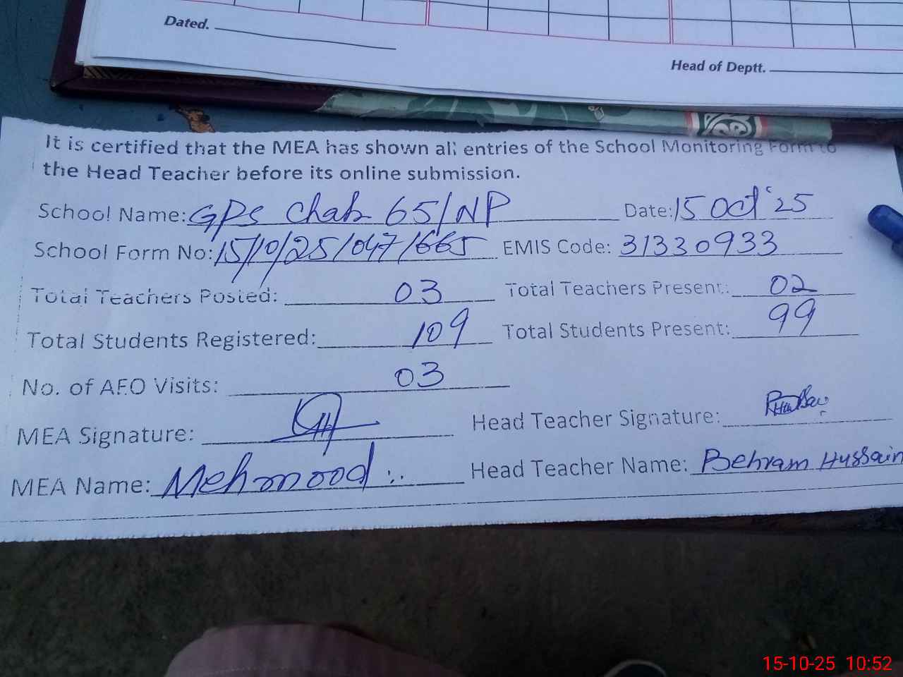 | Certified that this School was Inspected by the Undersigned MEA/DMO Today and the Information Stated Above is as Per Record. | |||||