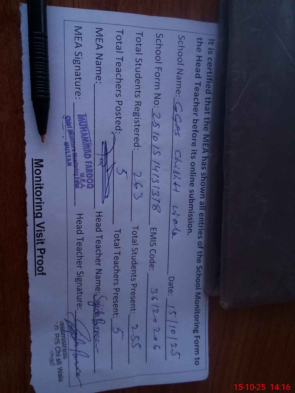 | Certified that this School was Inspected by the Undersigned MEA/DMO Today and the Information Stated Above is as Per Record. | |||||