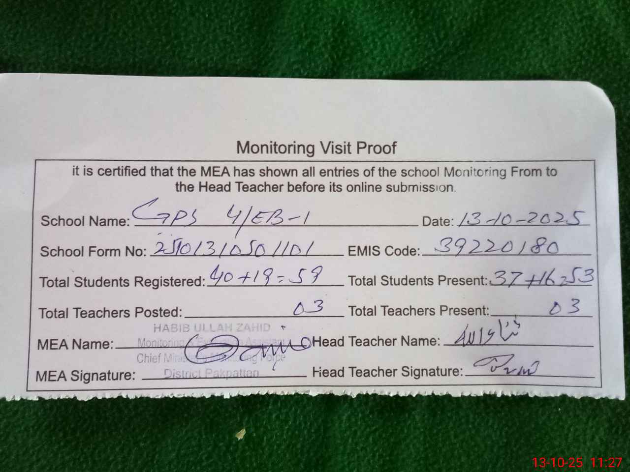 | Attendance Register | Head Teacher | MEA with School | Visit Proof |
