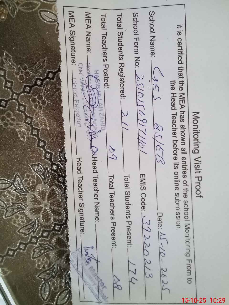 | Certified that this School was Inspected by the Undersigned MEA/DMO Today and the Information Stated Above is as Per Record. | |||||